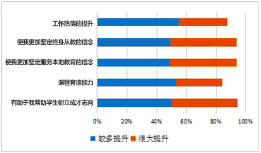 1.提高師德修養(yǎng),增強育人能力?!霸u價教師隊伍素質(zhì)的第一標準應(yīng)該是師德師風”。問卷調(diào)查結(jié)果表明3,88%的中西部教師提升了工作熱情,超過90%的參訓教師堅定了終身從教的信念。更難能可貴的是,94%的教師堅定了服務(wù)本地教育的信念。此外,85%的教師認為參與國培提升了課程德育能力,90%的教師認為參與國培有助于幫助學生樹立成才志向。