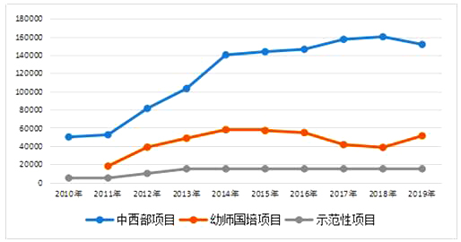 1. 財政投入強度大。2010-2019年,中央財政累計投入“國培計劃”經(jīng)費172億元。其中,中西部項目和幼師國培項目投入超過159億元,占比92%左右。十年來,國培參訓人均經(jīng)費增長了約2.6倍。中央政府的財政投入帶動了各級地方政府的教師培訓經(jīng)費投入,還吸引了社會機構(gòu)的參與。