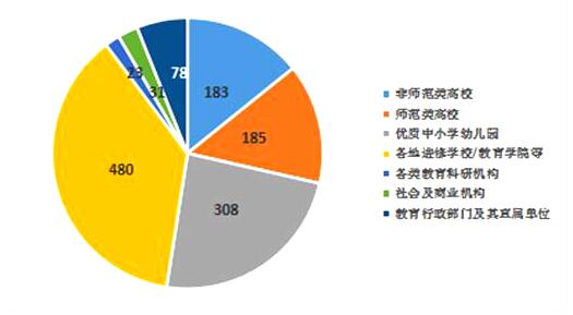 1.立體開放的承訓體系。在“國培計劃”的引領(lǐng)帶動下,我國構(gòu)建了“國培—省培—市培—縣培—校培”五級聯(lián)動的新型教師培訓網(wǎng)絡(luò),促成了開放競爭的教師培訓承訓局面。共有七類1288個的機構(gòu)承擔了“國培計劃”項目培訓任務(wù)。除了480所各地教師進修學校/教育學院和185所師范院校,還吸引了183所非師范類高校及其他類型機構(gòu)參與其中(圖3)。這些機構(gòu)通過承擔國培項目提升了自身專業(yè)培訓能力,深度參與了各類省市級、區(qū)縣級以及校本培訓,促進了教師培訓優(yōu)質(zhì)資源在全國范圍內(nèi)的充分利用。