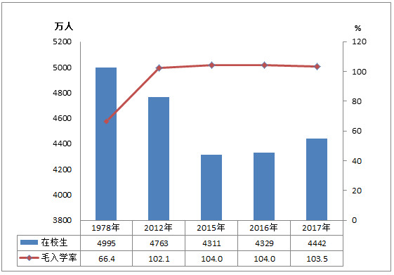 圖2 1978年、2012年、2015-2017年小學(xué)在校生和凈入學(xué)率