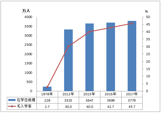 圖5 1978年、2012年、2015-2017年高等教育在學(xué)規(guī)模和毛入學(xué)率