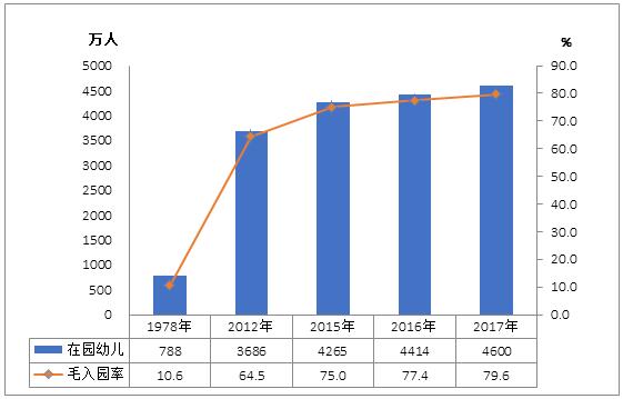 圖1 1978年、2012年、2015-2017年學(xué)前教育在園幼兒和毛入園率
