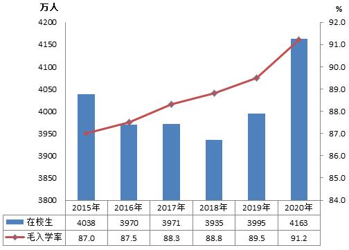 全國共有高中階段教育學(xué)校2.45萬所,比上年增加82所,增長0.34%;招生1521.10萬人,比上年增加81.24萬人,增長5.64%;在校生4163.02萬人,比上年增加168.12萬人,增長4.21%。高中階段毛入學(xué)率91.2%,比上年提高1.7個百分點。