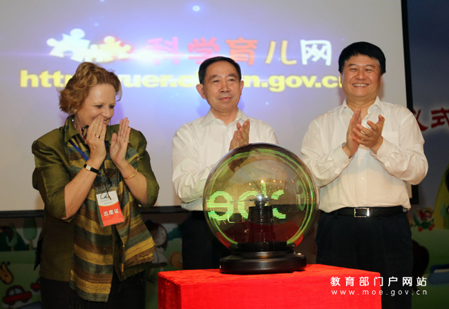 袁貴仁部長與聯(lián)合國兒基會駐華代表處代表麥吉蓮女士、北京市副市長洪峰共同開通科學育兒網(wǎng)站(中國教育報記者 修伯明攝)
