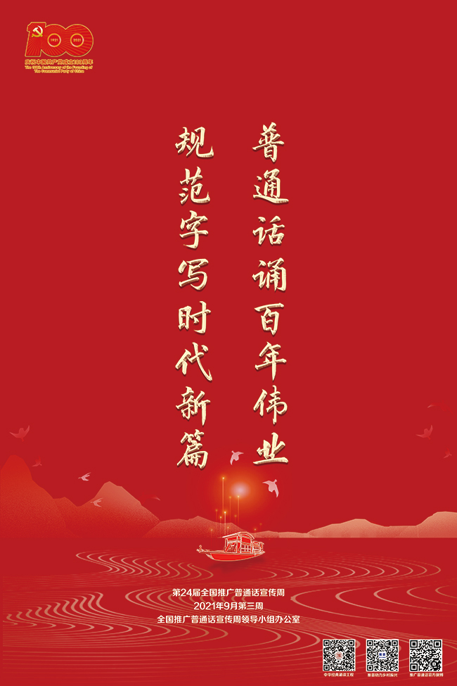 海報(bào)一,以“普通話誦百年偉業(yè) 規(guī)范字寫時(shí)代新篇”為設(shè)計(jì)思路,背景為中共一大會(huì)址浙江嘉興南湖,體現(xiàn)在黨的堅(jiān)強(qiáng)領(lǐng)導(dǎo)下語言文字事業(yè)百年光輝歷程。