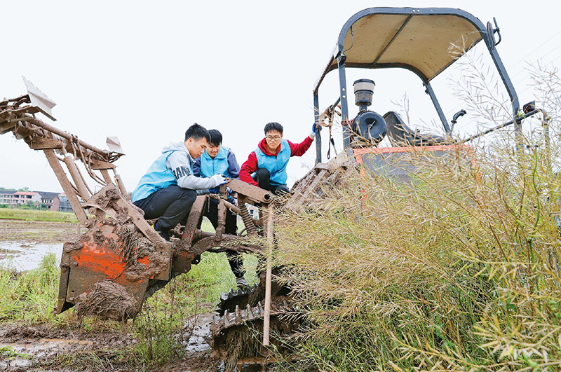 圖為2023年4月29日,南華大學(xué)的大學(xué)生志愿者利用五一假期到湖南省衡陽市衡陽縣西渡鎮(zhèn)新橋村開展勞動助農(nóng)行動,幫助農(nóng)民檢修、保養(yǎng)農(nóng)機,用勞動實踐助力鄉(xiāng)村振興。(新華社發(fā) 曹正平/攝)