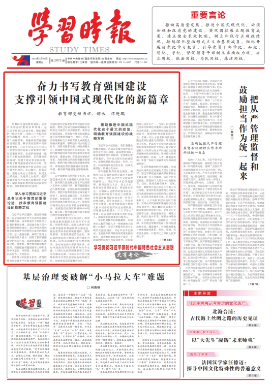 從教育與中國的關(guān)系看,教育的能力和發(fā)展水平在很大程度上決定著中國的現(xiàn)代化程度和中華民族的文明程度。教育已經(jīng)成為國家的戰(zhàn)略必爭和決定興衰存亡的關(guān)鍵要素。要自覺從強國建設(shè)、民族復(fù)興偉業(yè)的戰(zhàn)略高度上思考教育的屬性、地位、價值,看清楚新時代以來教育偉大成就蘊含的秘訣和邏輯,想明白如何主動擔當作為、找到對國家發(fā)展大局的戰(zhàn)略支點;看清楚當前國內(nèi)外形勢變化,想明白教育如何成為黨和國家事業(yè)的戰(zhàn)略先導(dǎo)、重要支撐;看清楚全球教育變革、科技發(fā)展競爭趨勢和教育發(fā)展規(guī)律,想明白如何構(gòu)建高質(zhì)量教育體系、謀劃提出教育強國建設(shè)的思路、舉措,推動教育強國建設(shè)順利破局、開局。