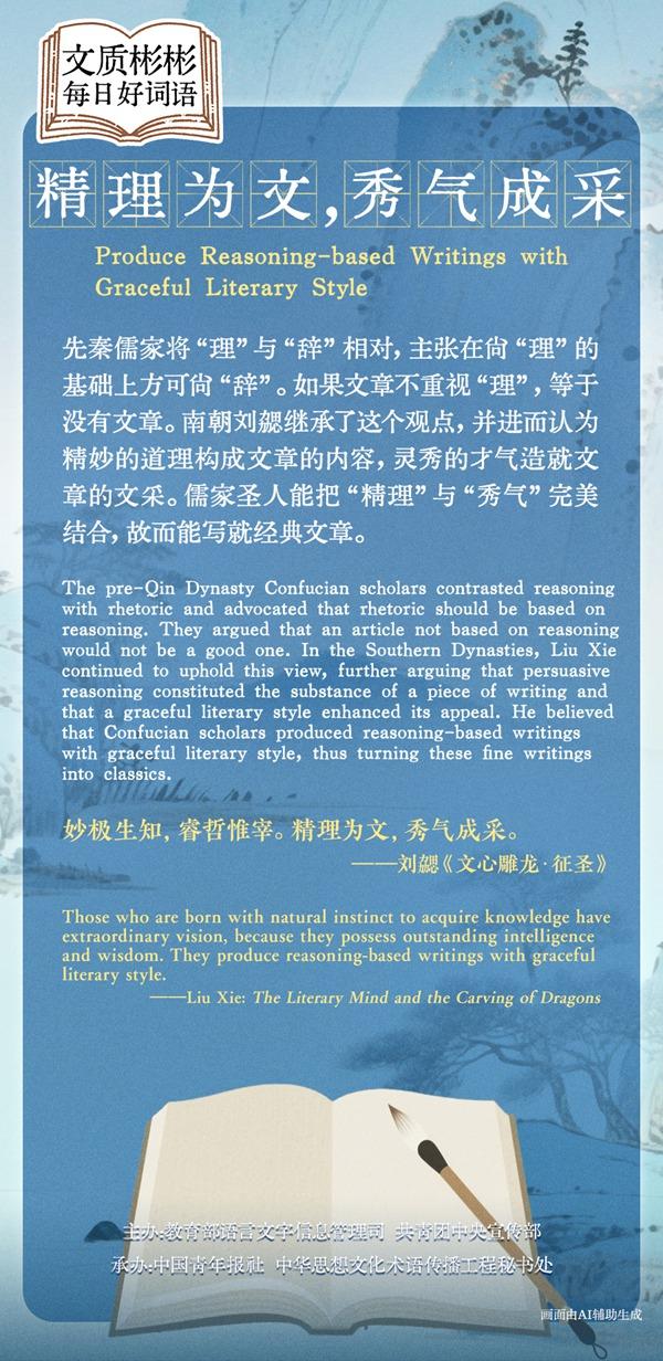 妙極生知,睿哲惟宰。精理為文,秀氣成采。(劉勰《文心雕龍·征圣》)(精妙到極致的是生而知之的人,因?yàn)樗麄儞碛型怀龅穆斆鞑胖?,從而可以主宰文章之道。他們以精妙的道理寫成文章,以靈秀的才氣造就文采。)