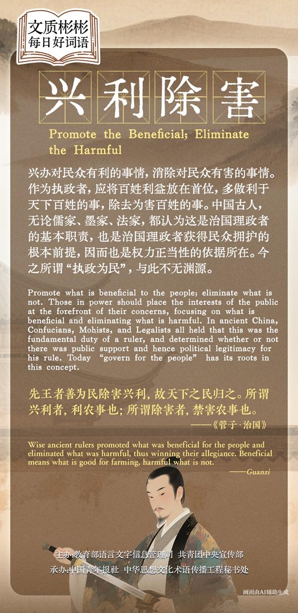 Wise ancient rulers promoted what was beneficial for the people and eliminated what was harmful, thus winning their allegiance. Beneficial means what is good for farming, while harmful means what is not. (Guanzi)