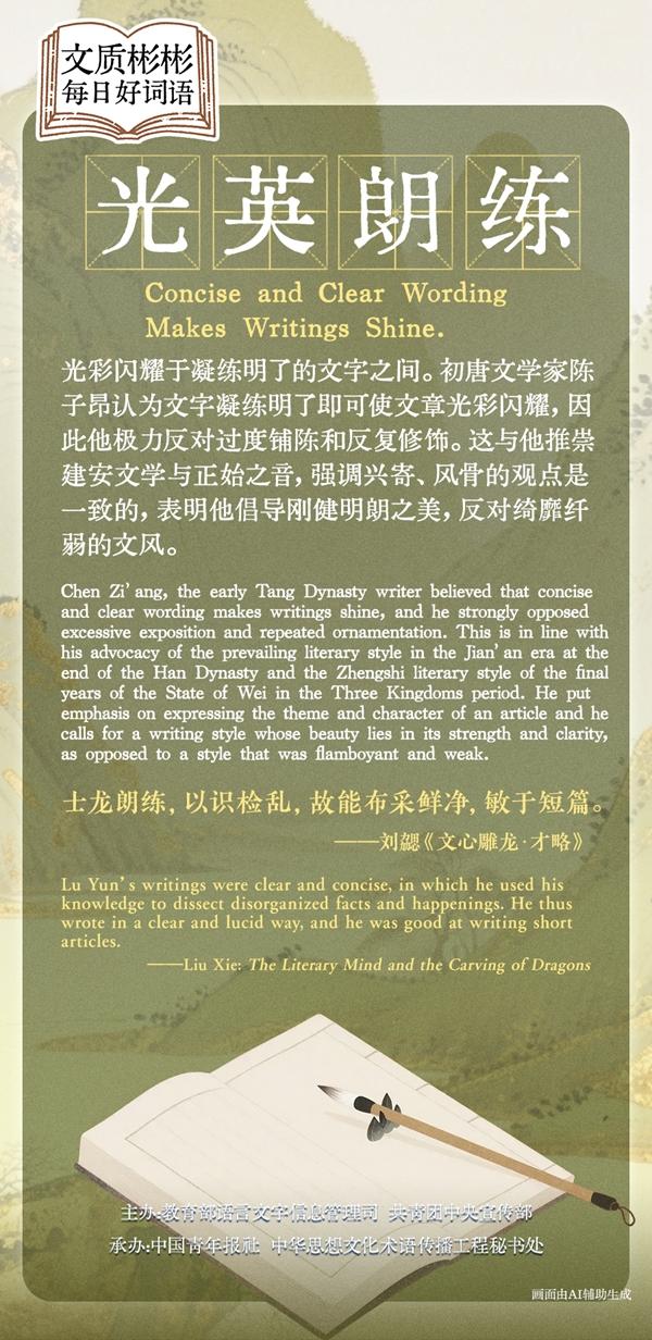 光彩閃耀于凝練明了的文字之間。初唐文學(xué)家陳子昂認(rèn)為文字凝練明了即可使文章光彩閃耀,因此他極力反對過度鋪陳和反復(fù)修飾。這與他推崇建安文學(xué)與正始之音,強調(diào)興寄、風(fēng)骨的觀點是一致的,表明他倡導(dǎo)剛健明朗之美,反對綺靡纖弱的文風(fēng)。