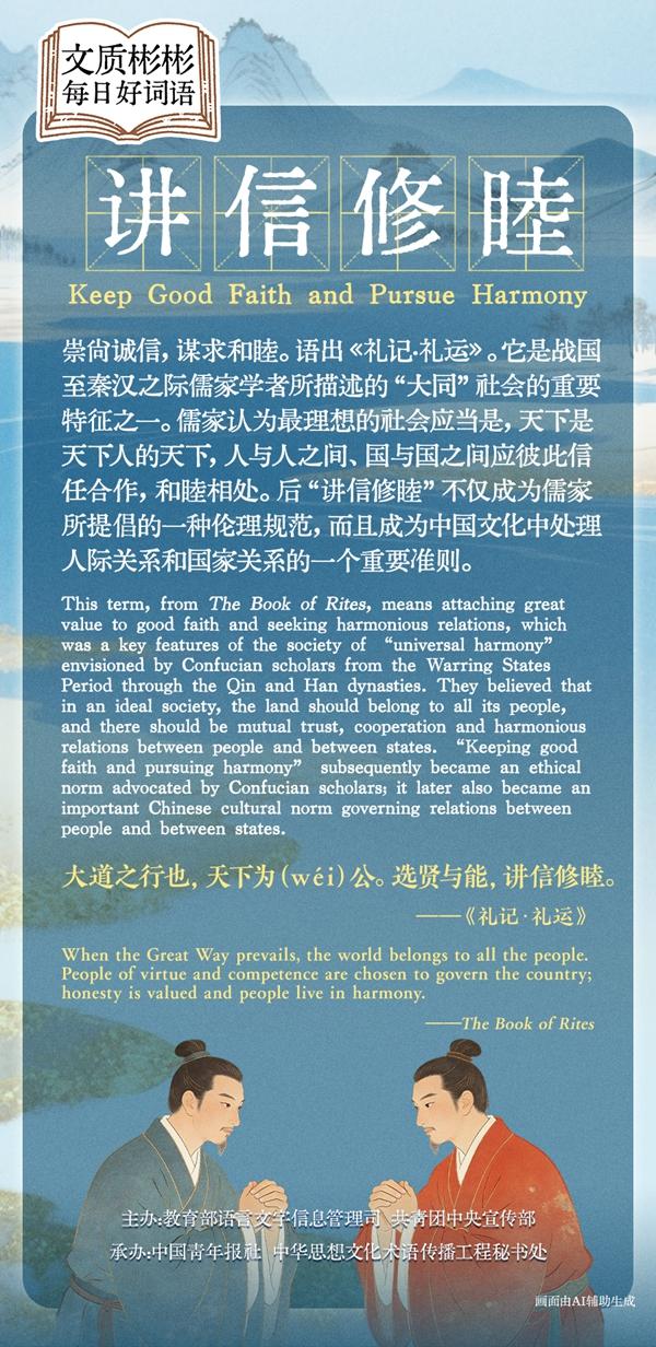This term, from The Book of Rites, means attaching great value to good faith and seeking harmonious relations, which was one of the key features of the society of "universal harmony" envisioned by Confucian scholars from the Warring States Period through the Qin and Han Dynasties. They believed that in an ideal society, the land should belong to all its people, and there should be mutual trust, cooperation and harmonious relations between people and between states. "Keeping good faith and pursuing harmony" subsequently became an ethical norm advocated by Confucian scholars; it later also became an important Chinese cultural norm governing relations between people and between states.