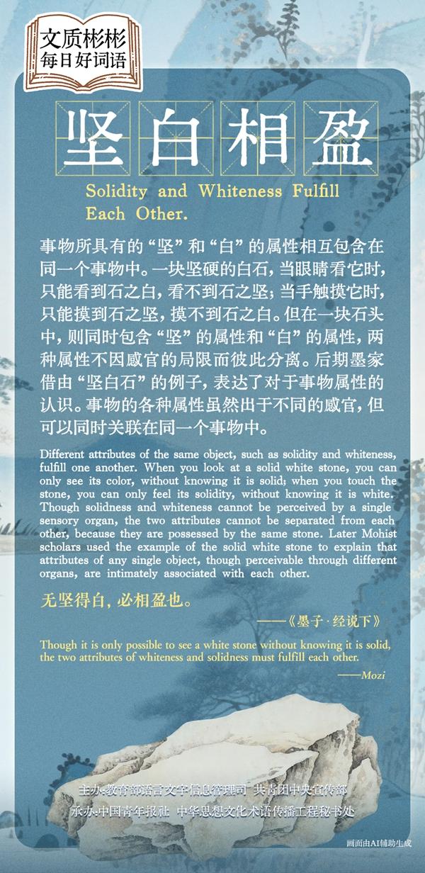 無堅(jiān)得白,必相盈也。(《墨子·經(jīng)說下》)(無法看到石頭的堅(jiān)硬而看到其白色,但石頭的堅(jiān)硬和白色必然相互包含在同一事物中。)