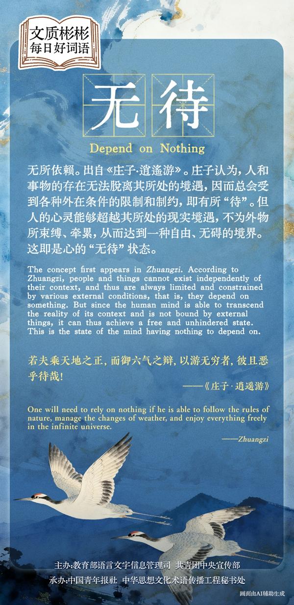 無所依賴。出自《莊子·逍遙游》。莊子認為,人和事物的存在無法脫離其所處的境遇,因而總會受到各種外在條件的限制和制約,即有所“待”。但人的心靈能夠超越其所處的現(xiàn)實境遇,不為外物所束縛、牽累,從而達到一種自由、無礙的境界。這即是心的“無待”狀態(tài)。