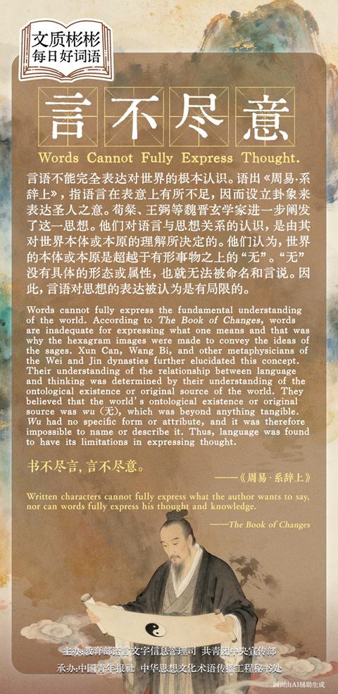 言語(yǔ)不能完全表達(dá)對(duì)世界的根本認(rèn)識(shí)。語(yǔ)出《周易·系辭上》,指語(yǔ)言在表意上有所不足,因而設(shè)立卦象來(lái)表達(dá)圣人之意。荀粲、王弼等魏晉玄學(xué)家進(jìn)一步闡發(fā)了這一思想。 他們對(duì)語(yǔ)言與思想關(guān)系的認(rèn)識(shí),是由其對(duì)世界本體或本原的理解所決定的。他們認(rèn)為,世界的本體或本原是超越于有形事物之上的“無(wú)”?!盁o(wú)”沒(méi)有具體的形態(tài)或?qū)傩裕簿蜔o(wú)法被命名和言說(shuō)。因此,言語(yǔ)對(duì)思想的表達(dá)被認(rèn)為是有局限的。