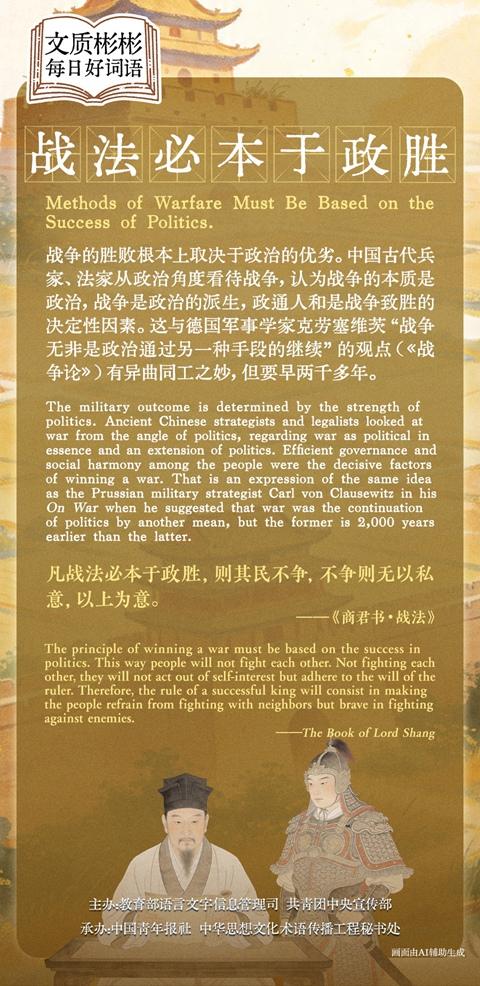 凡戰(zhàn)法必本于政勝,則其民不爭(zhēng),不爭(zhēng)則無以私意,以上為意。(《商君書·戰(zhàn)法》)(戰(zhàn)爭(zhēng)取勝的原則必須以政治上的優(yōu)勝為基礎(chǔ),這樣人民就不會(huì)相互爭(zhēng)斗;人民不相互爭(zhēng)斗,也就不會(huì)各逞私意,而都統(tǒng)一到君主的意志上來了。)