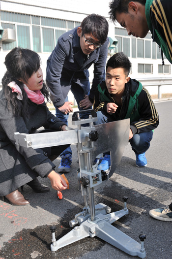 11月14日,在沈陽的遼寧省交通高等??茖W(xué)校,教師指導(dǎo)學(xué)生們進(jìn)行道路摩擦檢測。(新華社記者 孫瑞博攝)