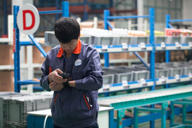11月22日,在山東省濰坊商業(yè)學(xué)校,一名學(xué)生通過(guò)手持終端查看物流信息。(新華社記者 白雪騏攝)
