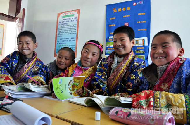 11月10日,幾名藏族孩子在天祝縣抓喜秀龍鄉(xiāng)代乾教學點新建成的教室內(nèi)上自習課。(新華社記者 郭剛/攝)