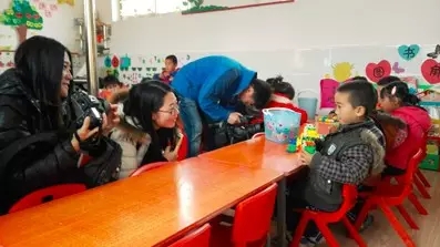 記者在和搭積木的小朋友聊天