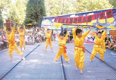 阜平縣平陽(yáng)中心校學(xué)生在表演武術(shù)。(資料圖片)
