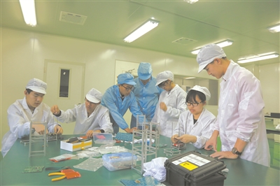 北京市八一學(xué)??破招⌒l(wèi)星團(tuán)隊(duì)在南京理工大學(xué)微納衛(wèi)星實(shí)驗(yàn)室進(jìn)行電性星組裝。 傅悅銘/攝