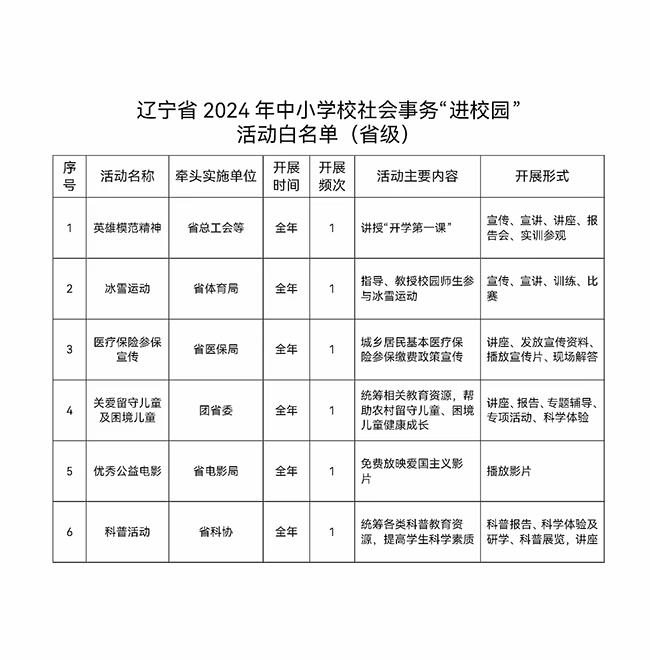 為持續(xù)推進(jìn)整治形式主義為基層減負(fù),按照中央教育工作領(lǐng)導(dǎo)小組秘書組關(guān)于開展規(guī)范社會(huì)事務(wù)進(jìn)校園為中小學(xué)教師減負(fù)專項(xiàng)整治工作的部署要求,在廣泛征求意見建議、充分研究論證基礎(chǔ)上,省委教育工作領(lǐng)導(dǎo)小組秘書組制定了《遼寧省2024年中小學(xué)校社會(huì)事務(wù)“進(jìn)校園”活動(dòng)白名單(省級(jí))》,現(xiàn)予以公布。
