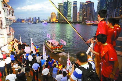 在第十二屆全國(guó)學(xué)生運(yùn)動(dòng)會(huì)閉幕式上,大家目送會(huì)旗由黃浦江駛向杭州灣方向。(本報(bào)記者 高海濤攝)