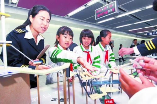 5月10日,首屆“職業(yè)教育活動周”上,北京交通運(yùn)輸職業(yè)學(xué)院學(xué)生給前來參觀的小學(xué)生介紹地鐵站設(shè)計(jì)原理。(中國教育報 記者 張勁松攝)