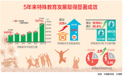 2014年,接受特殊教育的在校學(xué)生有39.49萬人。未入學(xué)殘疾兒童數(shù)從2010年的14.5萬人減少至2013年的8.3萬人。視力、聽力以及智力殘疾學(xué)生入學(xué)率提升,自閉癥、腦癱、多重殘疾學(xué)生人數(shù)逐年增加。