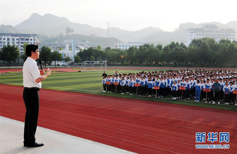 陳立群為臺江縣民族中學(xué)高三新生作動員講話。(9月3日新華社記者 胡星/攝)