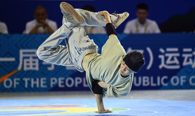 11月4日,第一屆全國學(xué)生(青年)運(yùn)動(dòng)會(huì)霹靂舞比賽在廣西欽州市體育中心體育館舉行。(新華社記者 張愛林/攝)