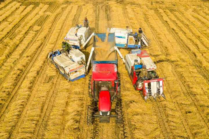 2024年10月13日,在黑龍江省綏化市北林區(qū)雙河鎮(zhèn)稻香村,村民駕駛農(nóng)機(jī)進(jìn)行卸糧作業(yè)(無(wú)人機(jī)照片)。(新華社記者 張濤/攝)
