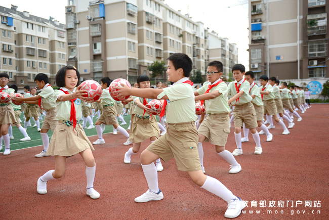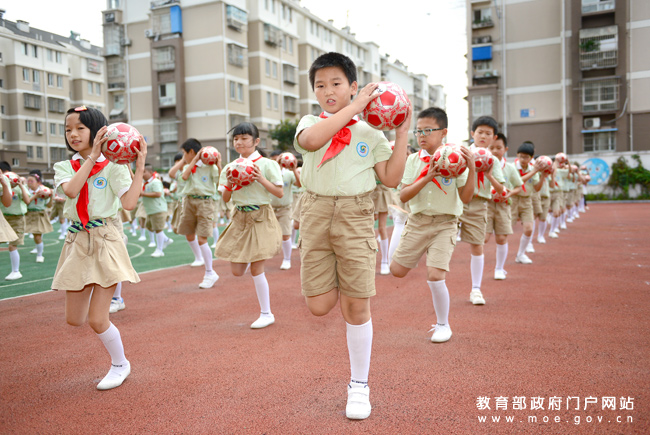 南京市秦淮第二實(shí)驗(yàn)小學(xué)為同學(xué)們?cè)O(shè)計(jì)的以足球和健身為主題的“足球韻律操”,成為該校大課間活動(dòng)的一個(gè)特色。(張玨瑛攝)