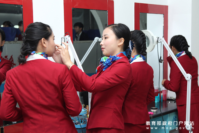 航空服務(wù)專業(yè)的學(xué)生們正在化妝。(中國教育報(bào)記者 張勁松攝)