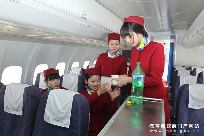 航空服務(wù)專業(yè)的學(xué)生們模擬空中乘務(wù)員工作。(中國教育報(bào)記者 張勁松攝)