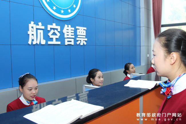 航空票務(wù)專業(yè)的學(xué)生們在模擬票務(wù)工作。(中國教育報(bào)記者 張勁松攝)