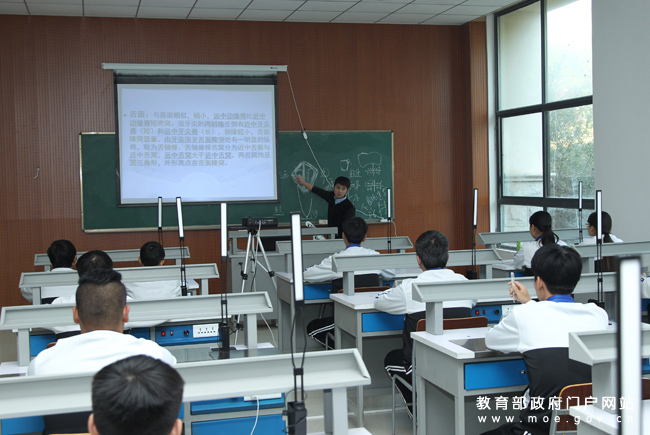 在河南省信陽航空服務(wù)學(xué)??谇患脊ぜ庸ぶ行?,老師正在給口腔技工專業(yè)的學(xué)生上課。(中國教育報(bào)記者 張勁松攝)