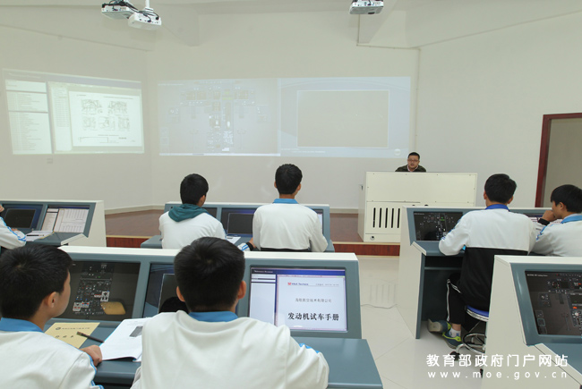 飛機(jī)維修專業(yè)的學(xué)生們在學(xué)習(xí)“發(fā)動(dòng)機(jī)試車”課程。(中國教育報(bào)記者 張勁松攝)