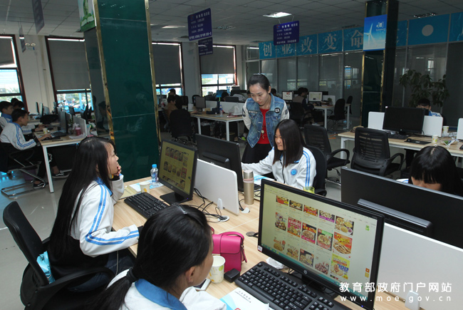 在河南省信陽電商大本營,老師在指導(dǎo)學(xué)生使用電商平臺(tái)。(中國教育報(bào)記者 張勁松攝)