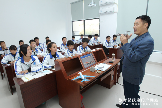 老師正在向?qū)W生介紹飛機(jī)的分類。(中國教育報(bào)記者 張勁松攝)