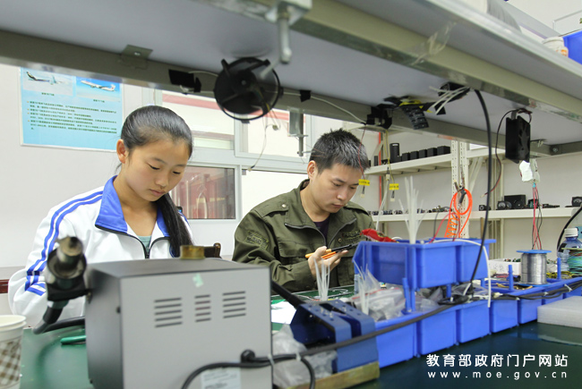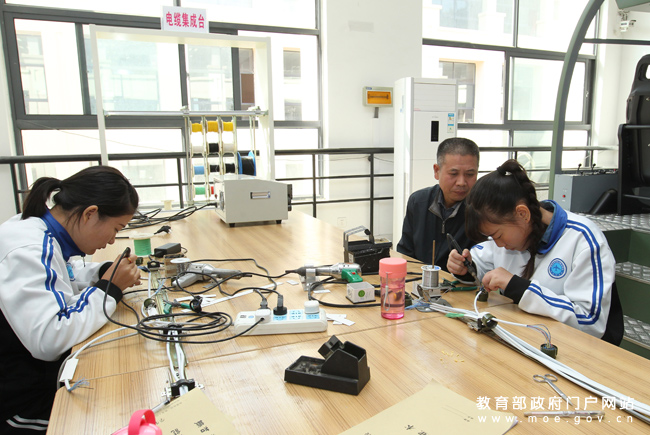 在實(shí)訓(xùn)車間,老師在指導(dǎo)學(xué)生進(jìn)行電纜集成操作。(中國教育報(bào)記者 張勁松攝)