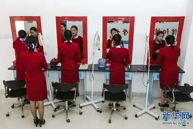 10月14日,在位于河南省信陽市平橋區(qū)的信陽航空服務學校,航空服務專業(yè)的中職學生在練習化妝。自2008年實施職教攻堅計劃和與教育部共建國家職教改革試驗區(qū)以來,河南省將職業(yè)教育放到強化中原崛起河南振興、增強區(qū)域競爭力的高度來謀劃,積極推進職業(yè)教育改革發(fā)展,推進全民技能振興工程的實施,并取得了階段性成果。截至2014年底,河南共有職業(yè)院校962所,職業(yè)院校在校生210萬人,高職、中職畢業(yè)生就業(yè)率分別保持在90%和96%以上。全省職業(yè)院校累計培養(yǎng)畢業(yè)生500多萬人,開展職業(yè)培訓2400多萬人次,這些技術(shù)技能型人才已經(jīng)成為產(chǎn)業(yè)大軍的主要來源。(新華社記者 沈伯韓攝)