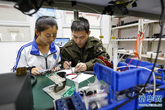 10月14日,在位于河南省信陽市平橋區(qū)的信陽航空服務學校實訓車間里,余仁忠老師(右)為學生游小翠講解焊制LED燈的技術(shù)。自2008年實施職教攻堅計劃和與教育部共建國家職教改革試驗區(qū)以來,河南省將職業(yè)教育放到強化中原崛起河南振興、增強區(qū)域競爭力的高度來謀劃,積極推進職業(yè)教育改革發(fā)展,推進全民技能振興工程的實施,并取得了階段性成果。截至2014年底,河南共有職業(yè)院校962所,職業(yè)院校在校生210萬人,高職、中職畢業(yè)生就業(yè)率分別保持在90%和96%以上。全省職業(yè)院校累計培養(yǎng)畢業(yè)生500多萬人,開展職業(yè)培訓2400多萬人次,這些技術(shù)技能型人才已經(jīng)成為產(chǎn)業(yè)大軍的主要來源。(新華社記者 沈伯韓攝)