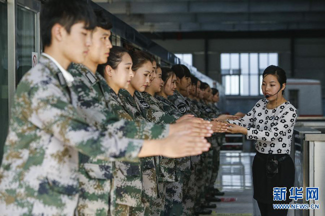 在鄭州城軌交通中等專業(yè)學校城市軌道交通實驗實訓中心,孟亞慶老師(右一)為乘務班中職學生講解交流禮儀(10月13日攝)。自2008年實施職教攻堅計劃和與教育部共建國家職教改革試驗區(qū)以來,河南省將職業(yè)教育放到強化中原崛起河南振興、增強區(qū)域競爭力的高度來謀劃,積極推進職業(yè)教育改革發(fā)展,推進全民技能振興工程的實施,并取得了階段性成果。截至2014年底,河南共有職業(yè)院校962所,職業(yè)院校在校生210萬人,高職、中職畢業(yè)生就業(yè)率分別保持在90%和96%以上。全省職業(yè)院校累計培養(yǎng)畢業(yè)生500多萬人,開展職業(yè)培訓2400多萬人次,這些技術(shù)技能型人才已經(jīng)成為產(chǎn)業(yè)大軍的主要來源。(新華社記者 沈伯韓攝)