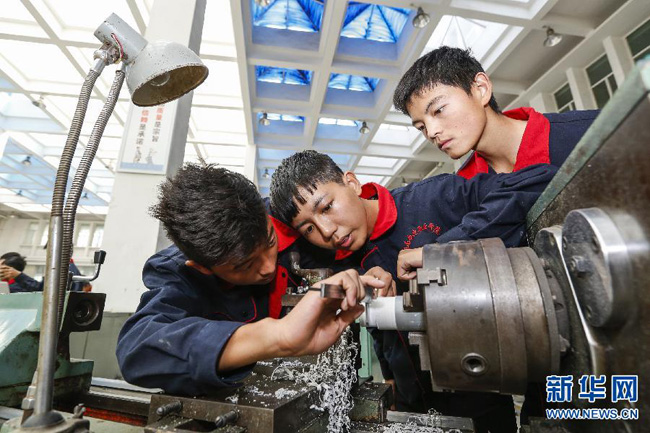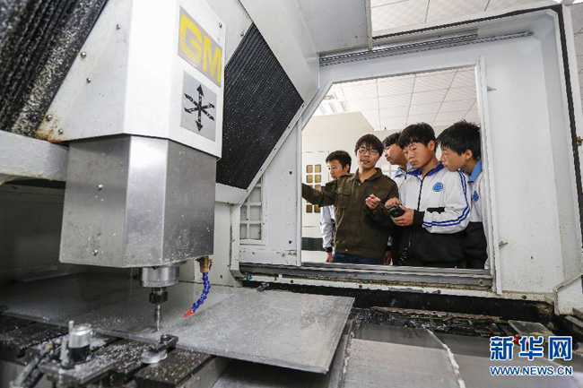 10月14日,在位于河南省信陽市平橋區(qū)的信陽航空服務學校實訓車間,張玉超老師(左二)為數(shù)控專業(yè)的學生講解如何運用加工中心制作飛機駕駛艙內(nèi)燈盒。自2008年實施職教攻堅計劃和與教育部共建國家職教改革試驗區(qū)以來,河南省將職業(yè)教育放到強化中原崛起河南振興、增強區(qū)域競爭力的高度來謀劃,積極推進職業(yè)教育改革發(fā)展,推進全民技能振興工程的實施,并取得了階段性成果。截至2014年底,河南共有職業(yè)院校962所,職業(yè)院校在校生210萬人,高職、中職畢業(yè)生就業(yè)率分別保持在90%和96%以上。全省職業(yè)院校累計培養(yǎng)畢業(yè)生500多萬人,開展職業(yè)培訓2400多萬人次,這些技術(shù)技能型人才已經(jīng)成為產(chǎn)業(yè)大軍的主要來源。(新華社記者 沈伯韓攝)