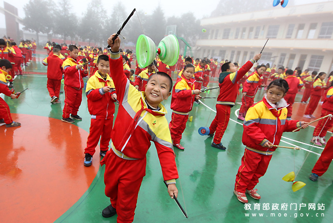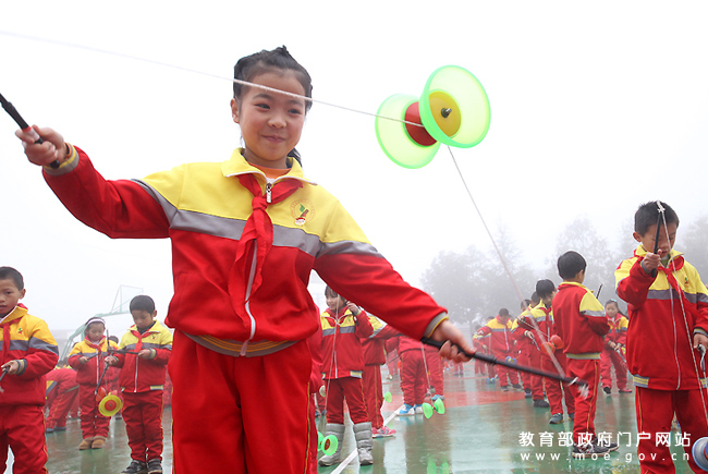 學(xué)生正在課間操時(shí)間抖空竹。“抖空竹”本是北方流行的運(yùn)動(dòng),校長(zhǎng)了解到“抖空竹”運(yùn)動(dòng)十分有利于學(xué)生的身體健康,便把這項(xiàng)北方的運(yùn)動(dòng)帶到了貴州的深山。(樊世剛/攝 王唯/文)