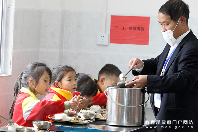 老師正在給食堂就餐的學(xué)生盛菜。每天11點(diǎn)30分準(zhǔn)時(shí)開餐,食堂不大,只能容納1-3年級(jí)的學(xué)生就餐,4-6年級(jí)的學(xué)生則只能由老師將飯菜拿到教室就餐。(樊世剛/攝 王唯/文)