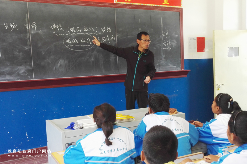 在山南市第三高級中學高一(25)班教室內(nèi),湖南援藏教師鄧劍正在給藏族學生上生物課。近日,教育部新聞辦組織中央媒體采訪團奔赴西藏,就“組團式”教育人才援藏工作進行深入采訪。8月25日,采訪團一行走進了由湖南省組團式教育援助的山南市第三高級中學。(忠建豐/攝)