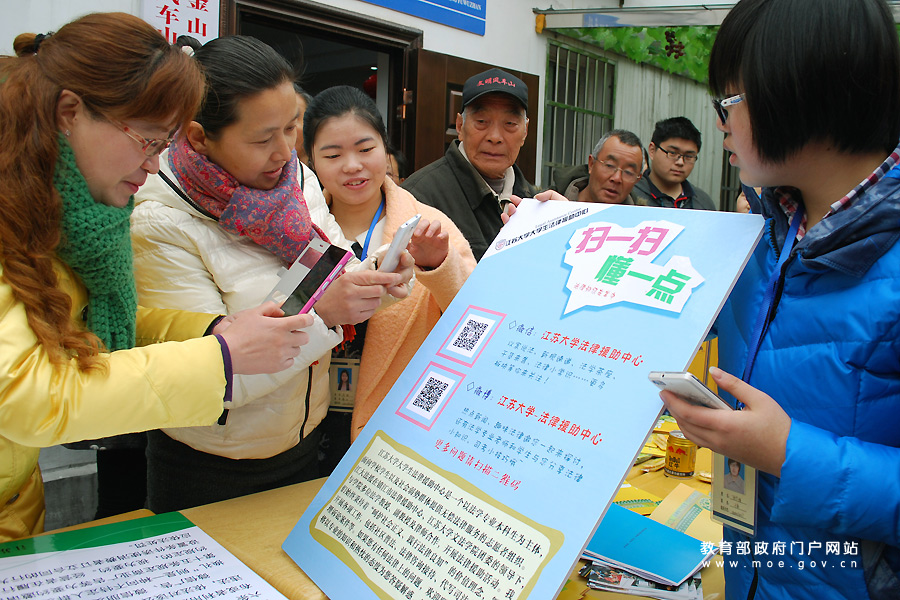 1/0志愿者在指導(dǎo)居民掃描法律援助中心的微信公眾號(hào)了解法律維權(quán)知識(shí)。(石玉成 任梅/攝)