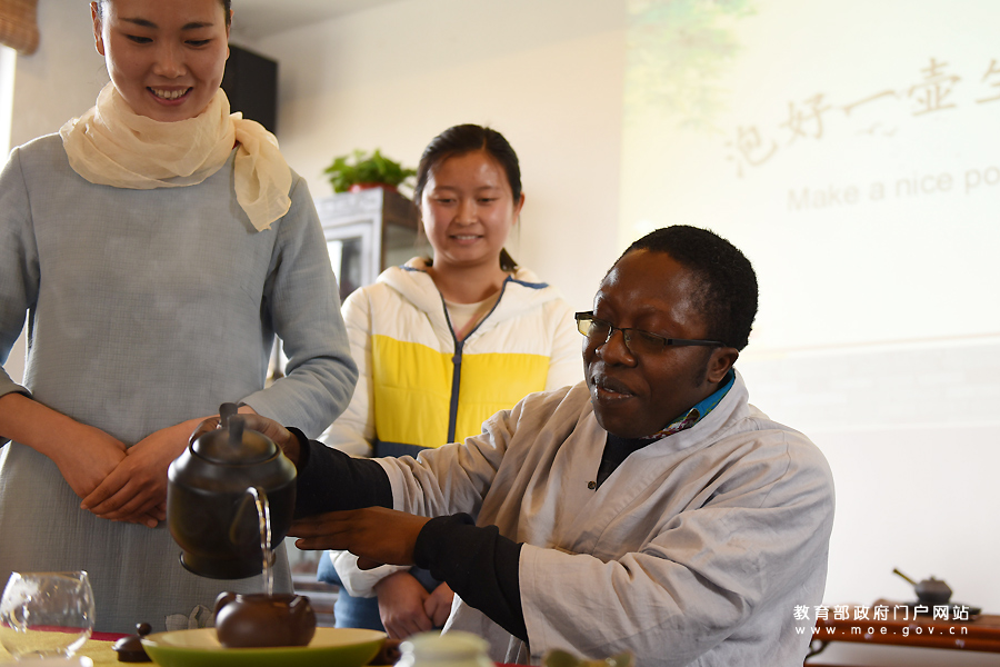 來自加納的留學(xué)生Emmanuel Kwaw在體驗沖泡茶葉。(徐國文 楊雨/攝)